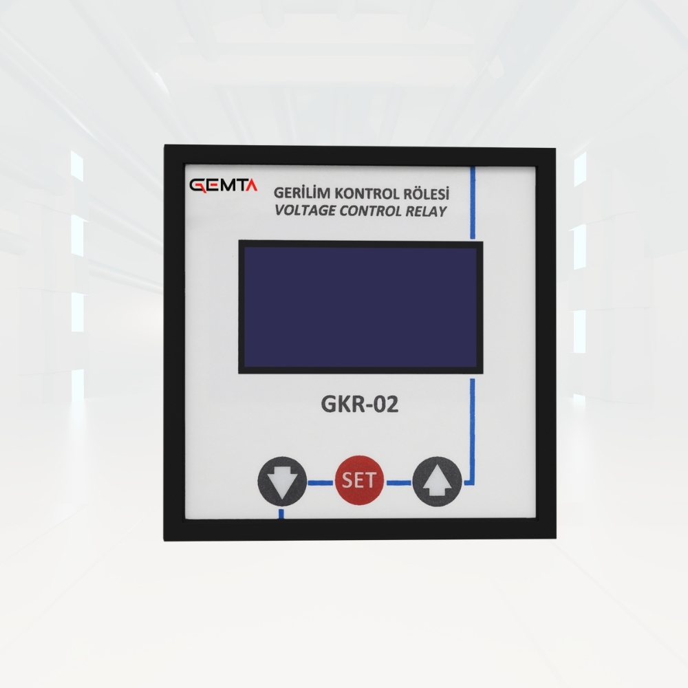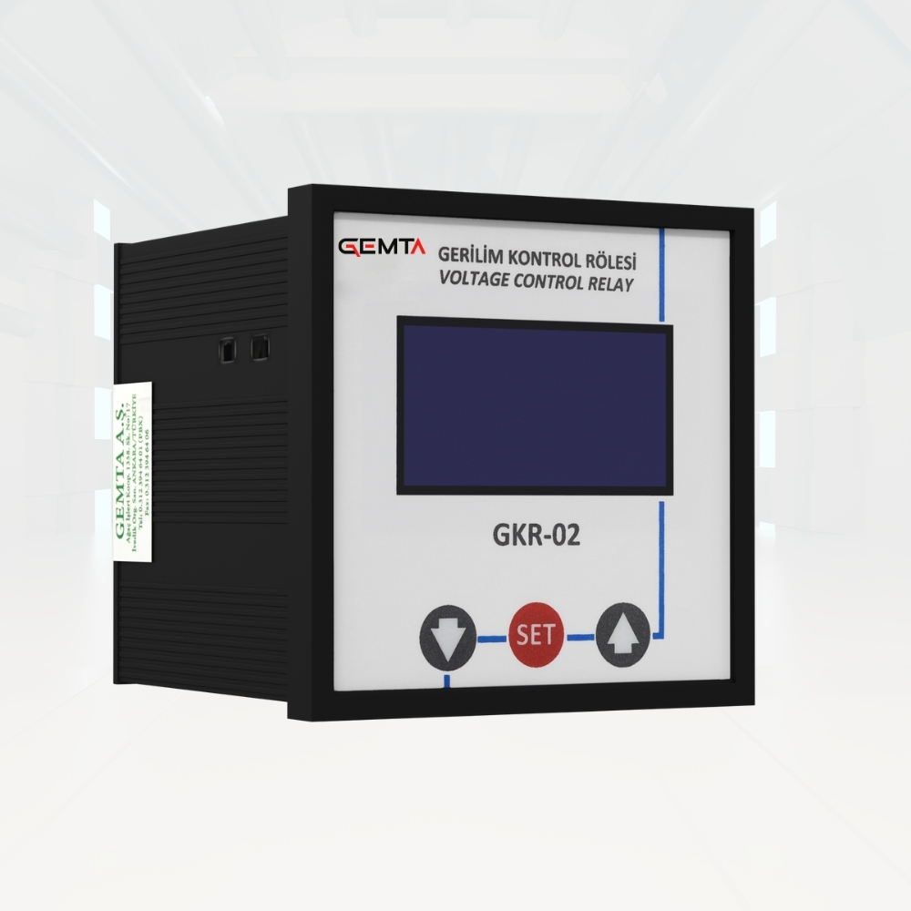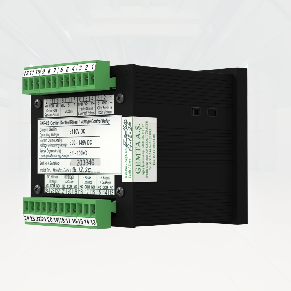 GKR-02 Gerilim Kontrol ve İzleme Ünitesi, DC Sistemlerinin gerilimini ve bu sistemlere bağlı toprak hattında oluşabilecek kaçakların direncini ölçmek amacıyla kullanılır. Toprak hattında oluşabilecek kaçakların direnç değeri "kohm" olarak kullanıcıya gösterilir. GKR-02 128x64px Grafik LCD ekranı ile DC Gerilim, kaçak direnci ve diğer tüm parametleri kullanıcının ayarlamasına ve izlemesine imkan tanır. Endüstriyel haberleşme protokolü olan MODBUS RTU üzerinden tüm parametreler izlenebilir.
